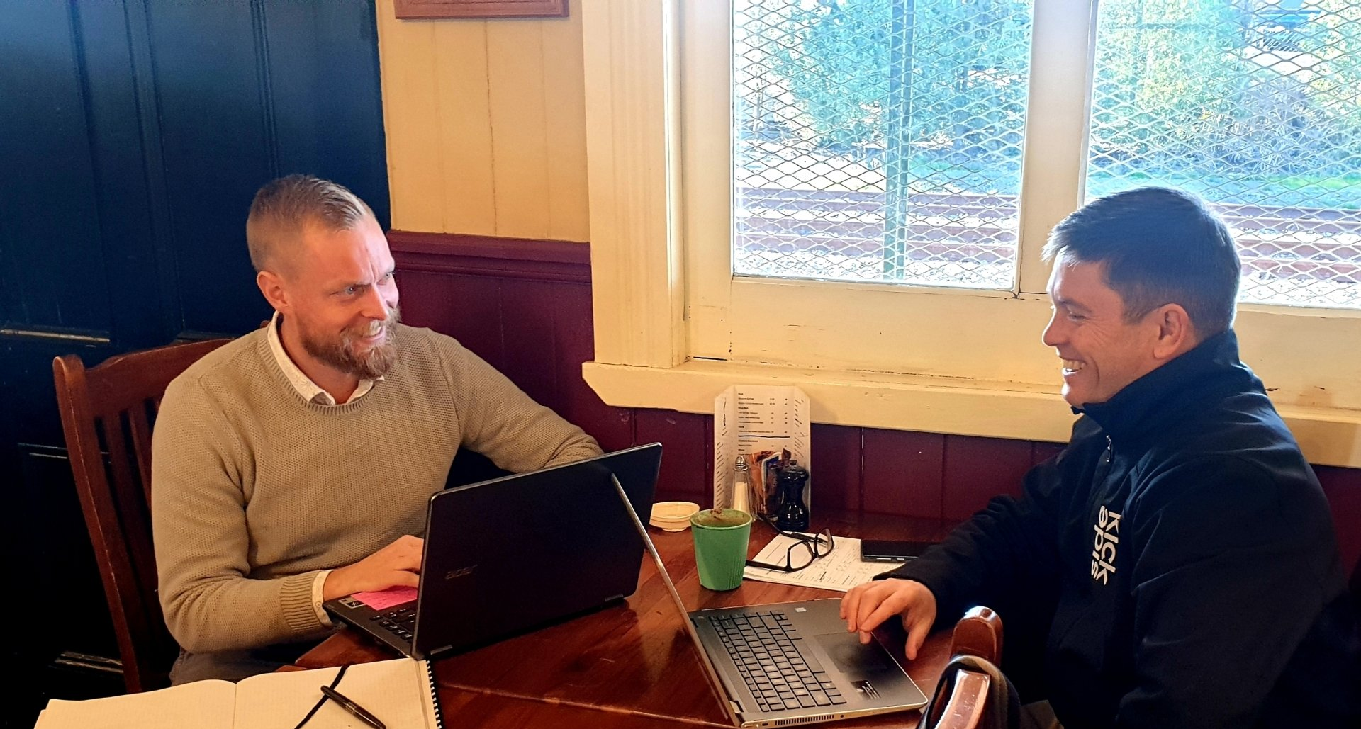 Sidekick’s Ric Thorpe catches up with business partner and Sidekick Rangiora director Jason Stapley at a Rangiora café.